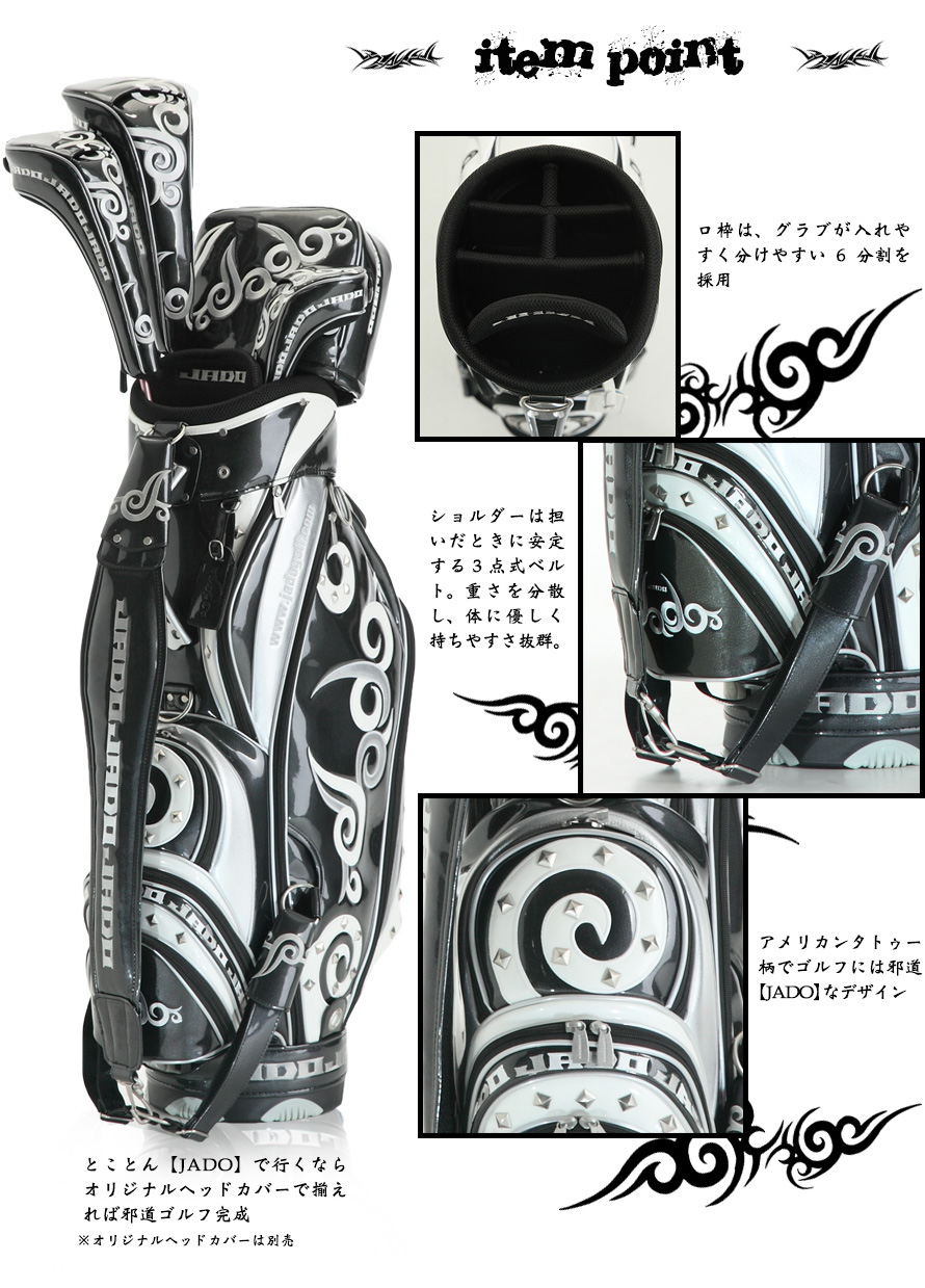 TOP キャディーバッグJADO(ジャド) ブランド別JADO(ジャド) Tatooシリーズ ゴルフキャディバッグ ブラック×ホワイト 価格: ¥40,700 (税込) [ポイント還元 407ポイント~] 販売期間: 数量: 個 在庫: × 在庫 × 返品についての詳細はこちら ◆アメリカンタトゥー柄でゴルフには邪道【JADO】なデザイン。 ◆ショルダーベルト3点式で持ちやすさは抜群。 ◆素材は、特殊エナメル加工。(シボ入りエナメル) ◆カラーは限定100本。 【商品詳細】 ・口枠:9インチ、6分割 ・重量:約4.8kg ・カラー:ブラック×ホワイト ・素材:Patent leather(エナメル) ・定価:37,000円(税抜) ・品番:JGCB7671