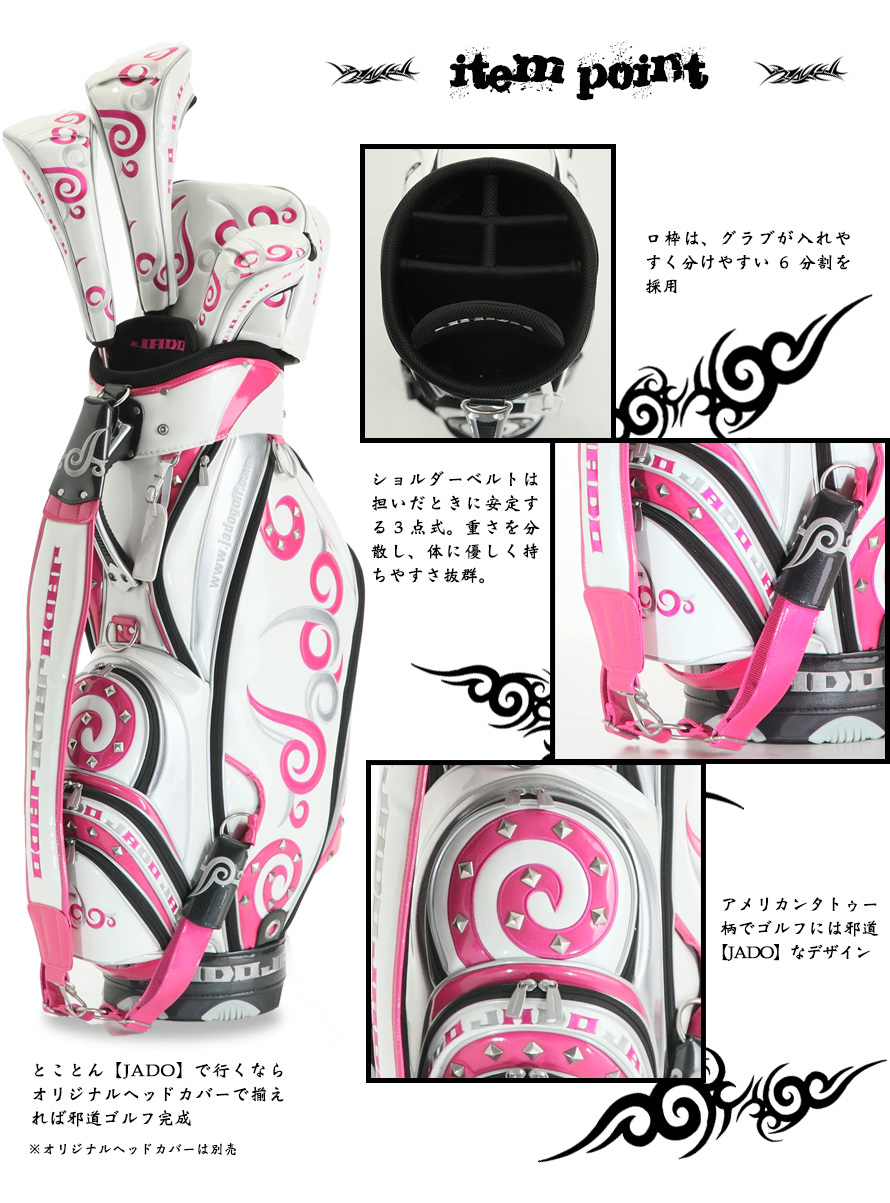 TOP キャディーバッグJADO(ジャド) ブランド別JADO(ジャド) Tatooシリーズ ゴルフキャディバッグ ホワイト×ピンク 価格: ¥40,700 (税込) [ポイント還元 407ポイント~] 販売期間: 数量: 個 在庫: × 在庫 × 返品についての詳細はこちら ◆アメリカンタトゥー柄でゴルフには邪道【JADO】なデザイン。 ◆ショルダーベルト3点式で持ちやすさは抜群。 ◆素材は、特殊エナメル加工。(シボ入りエナメル) ◆カラーは限定100本。 【商品詳細】 ・口枠:9インチ、6分割 ・重量:約4.8kg ・カラー:ホワイト×ピンク ・素材:Patent leather(エナメル) ・定価:37,000円(税抜) ・品番:JGCB7671