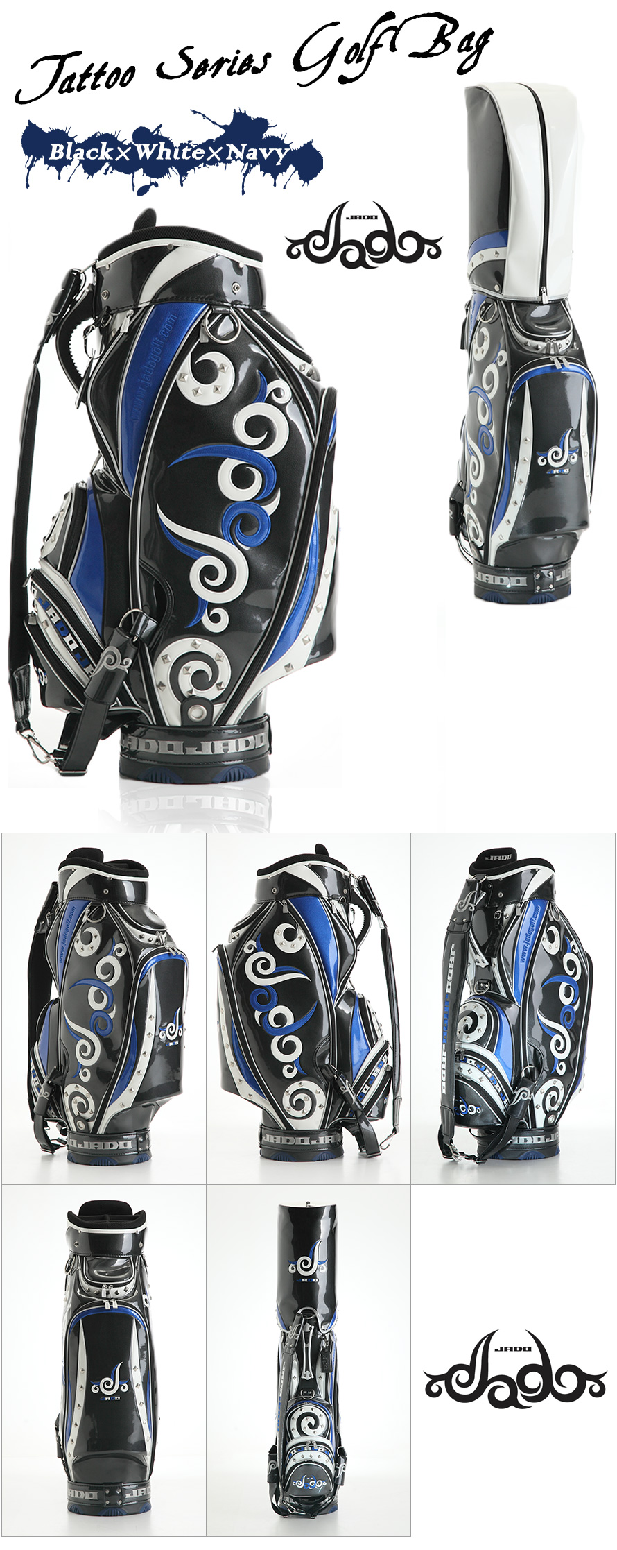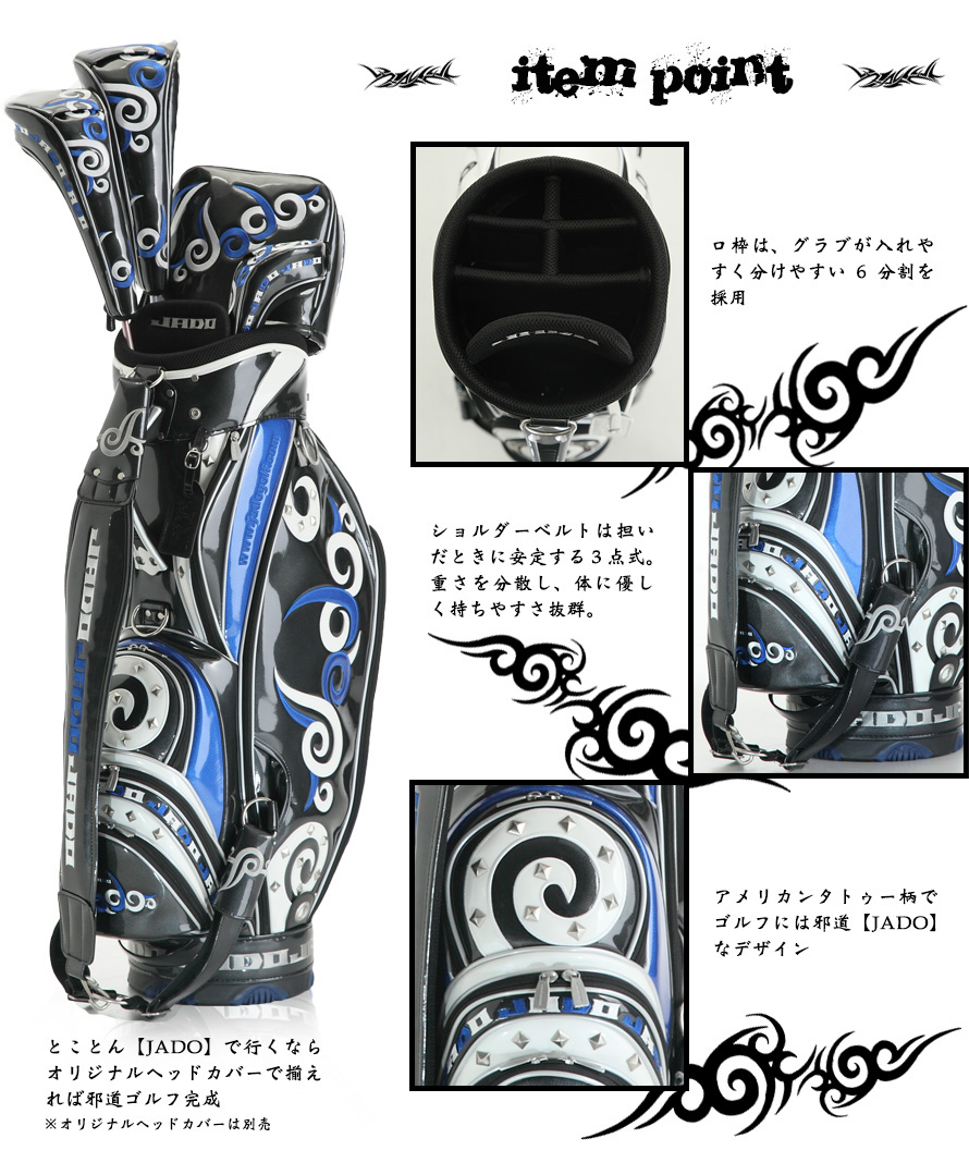 TOP キャディーバッグJADO(ジャド) ブランド別JADO(ジャド) Tatooシリーズ ゴルフキャディバッグ ブラック×ネイビー×ホワイト 価格: ¥40,700 (税込) [ポイント還元 407ポイント~] 販売期間: 数量: 個 在庫: × 在庫 × 返品についての詳細はこちら ◆アメリカンタトゥー柄でゴルフには邪道【JADO】なデザイン。 ◆ショルダーベルト3点式で持ちやすさは抜群。 ◆素材は、特殊エナメル加工。(シボ入りエナメル) ◆カラーは限定100本。 【商品詳細】 ・口枠:9インチ、6分割 ・重量:約4.8kg ・カラー:ブラック×ネイビー×ホワイト ・素材:Patent leather(エナメル) ・定価:37,000円(税抜) ・品番:JGCB7671