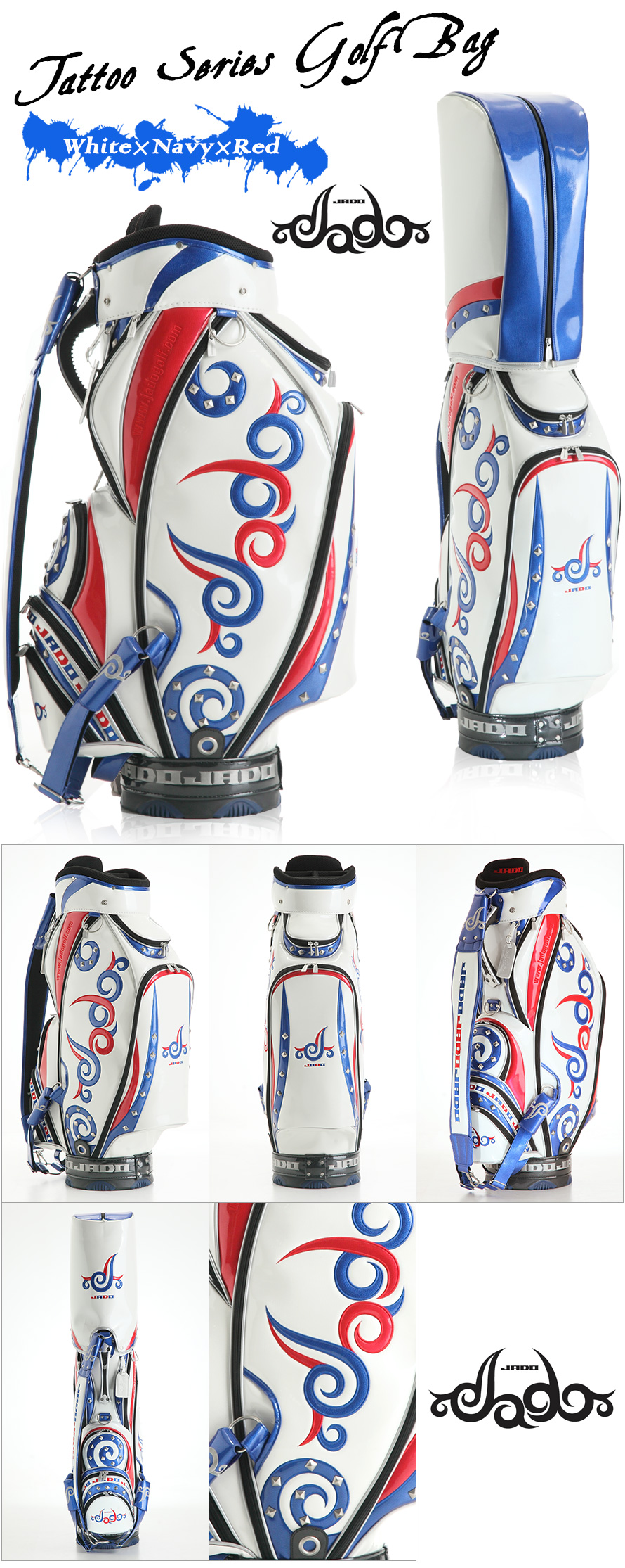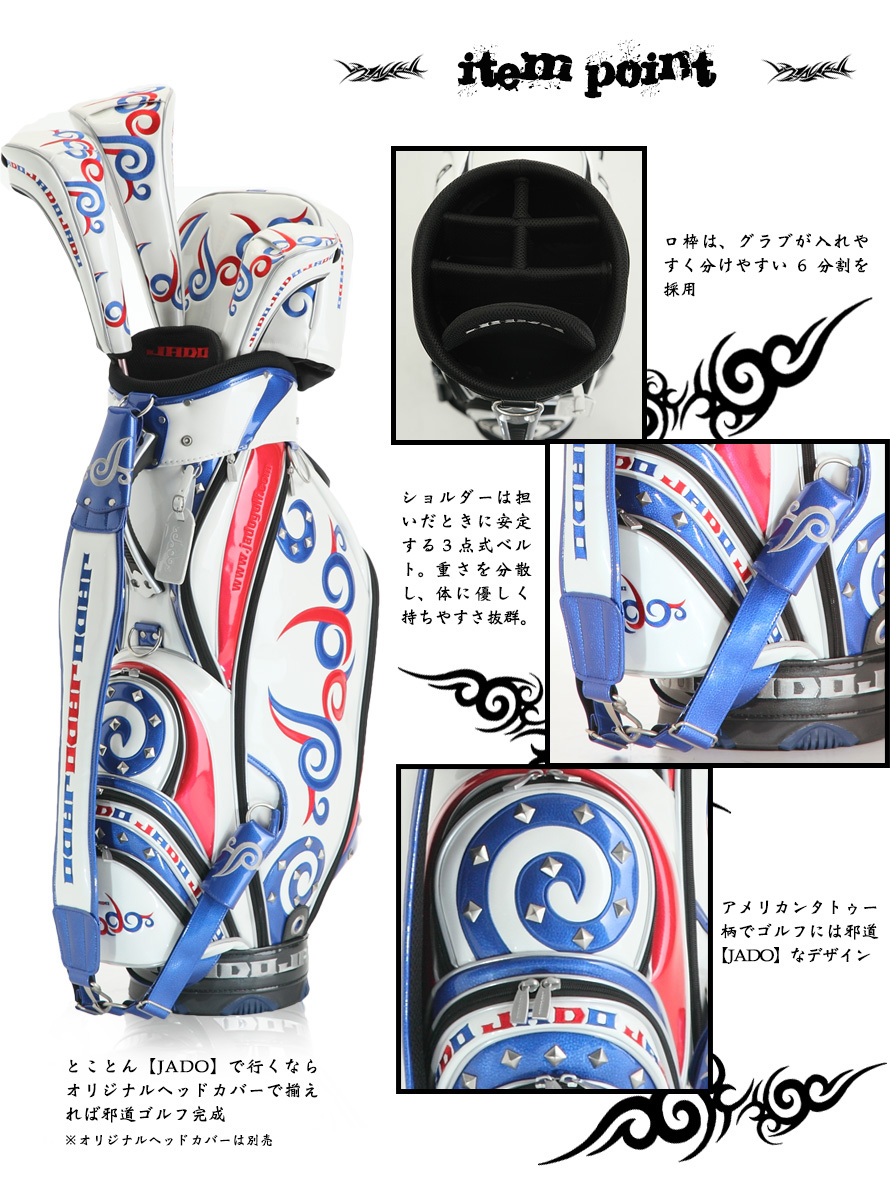 TOP キャディーバッグJADO(ジャド) ブランド別JADO(ジャド) Tatooシリーズ ゴルフキャディバッグ ホワイト×ネイビー×レッド 価格: ¥40,700 (税込) [ポイント還元 407ポイント~] 販売期間: 数量: 個 在庫: × 在庫 × 返品についての詳細はこちら ◆アメリカンタトゥー柄でゴルフには邪道【JADO】なデザイン。 ◆ショルダーベルト3点式で持ちやすさは抜群。 ◆素材は、特殊エナメル加工。(シボ入りエナメル) ◆カラーは限定100本。 【商品詳細】 ・口枠:9インチ、6分割 ・重量:約4.8kg ・カラー:ホワイト×ネイビー×レッド ・素材:Patent leather(エナメル) ・定価:37,000円(税抜) ・品番:JGCB7671