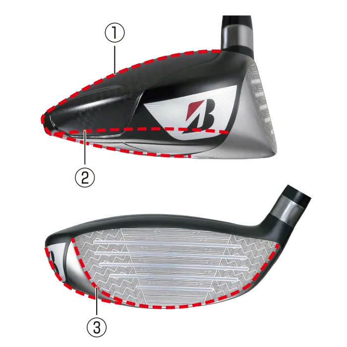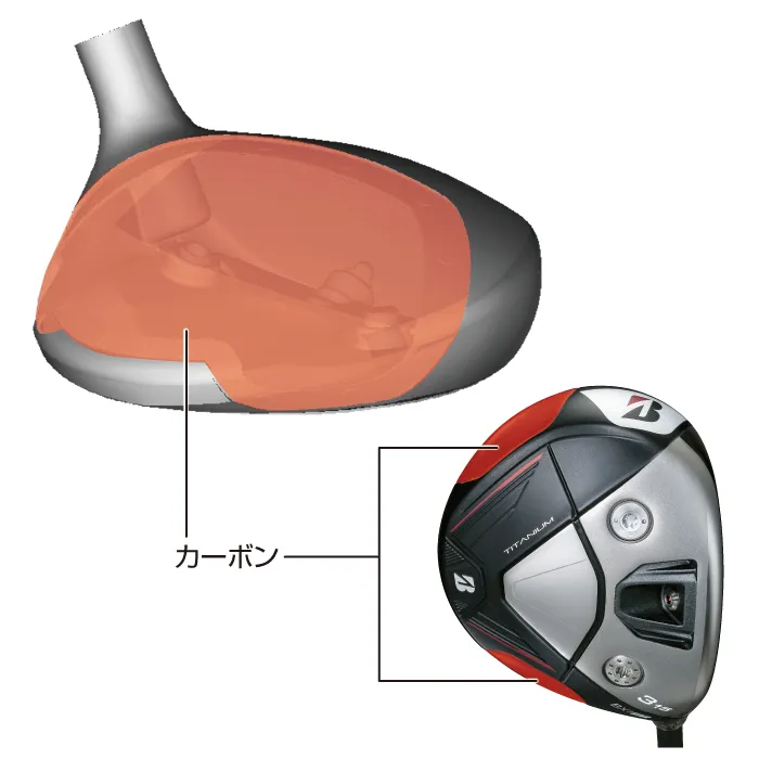 クラウンからソール側のトゥとヒールにかけてカーボンを配置することで低重心化、低スピンで飛ばす。