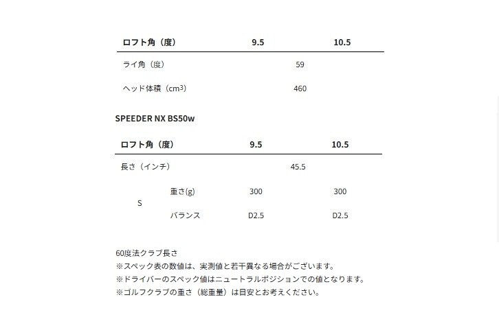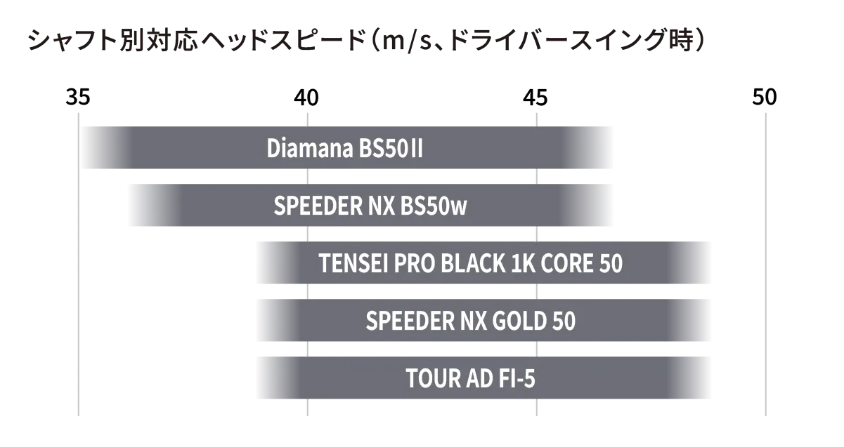 ※スペック値はメーカー(TENSEI=三菱ケミカル社、SPEEDER=藤倉コンポジット社、TOUR AD=グラファイトデザイン社)公表値です。