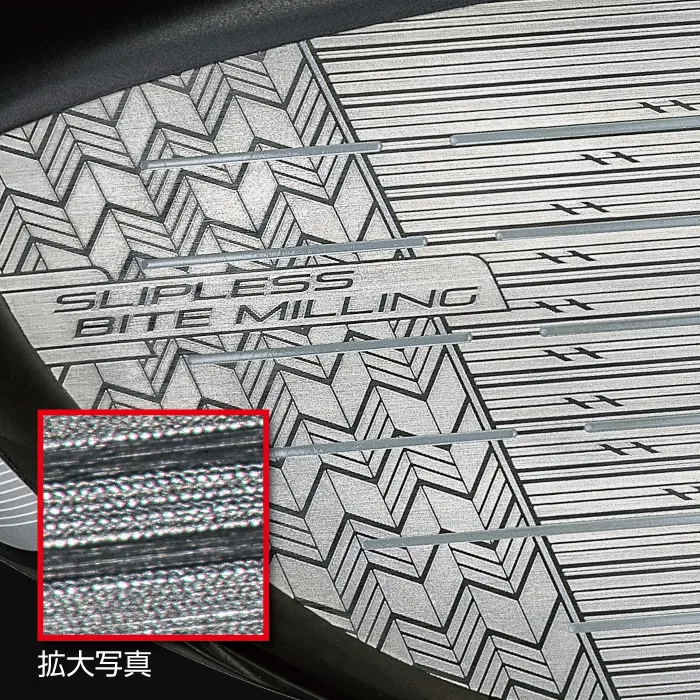 独自のスリップレスバイトミーリングをフェース全面に搭載。インパクト時のボールへの食いつきをさらに高めフェースの滑りを抑え、低スピン化。