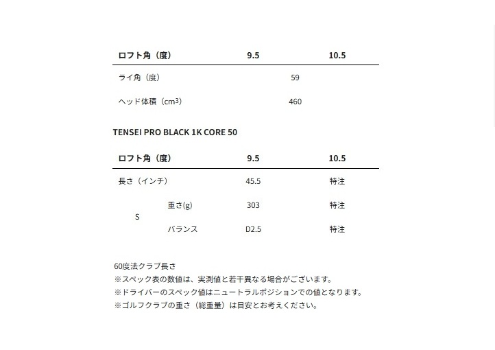 ※スペック値はメーカー(TENSEI=三菱ケミカル社、SPEEDER=藤倉コンポジット社、TOUR AD=グラファイトデザイン社)公表値です。