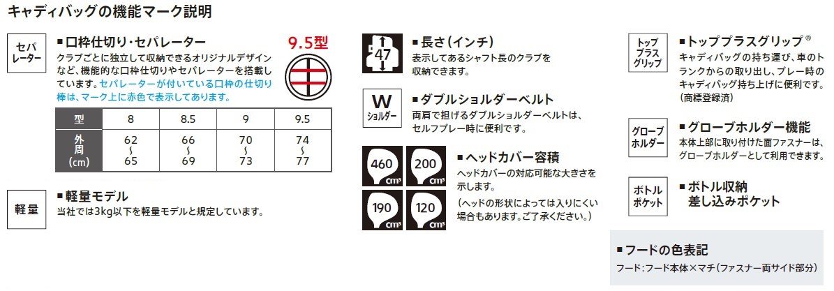 機能:トッププラスグリップ、セパレーター、ボトルポケット、Wショルダーベルト