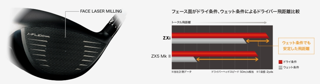 悪条件下※でもフェースレーザーミーリングによりボールが食いつき、しっかりスピンコントロールすることで安定した飛距離性能を実現。