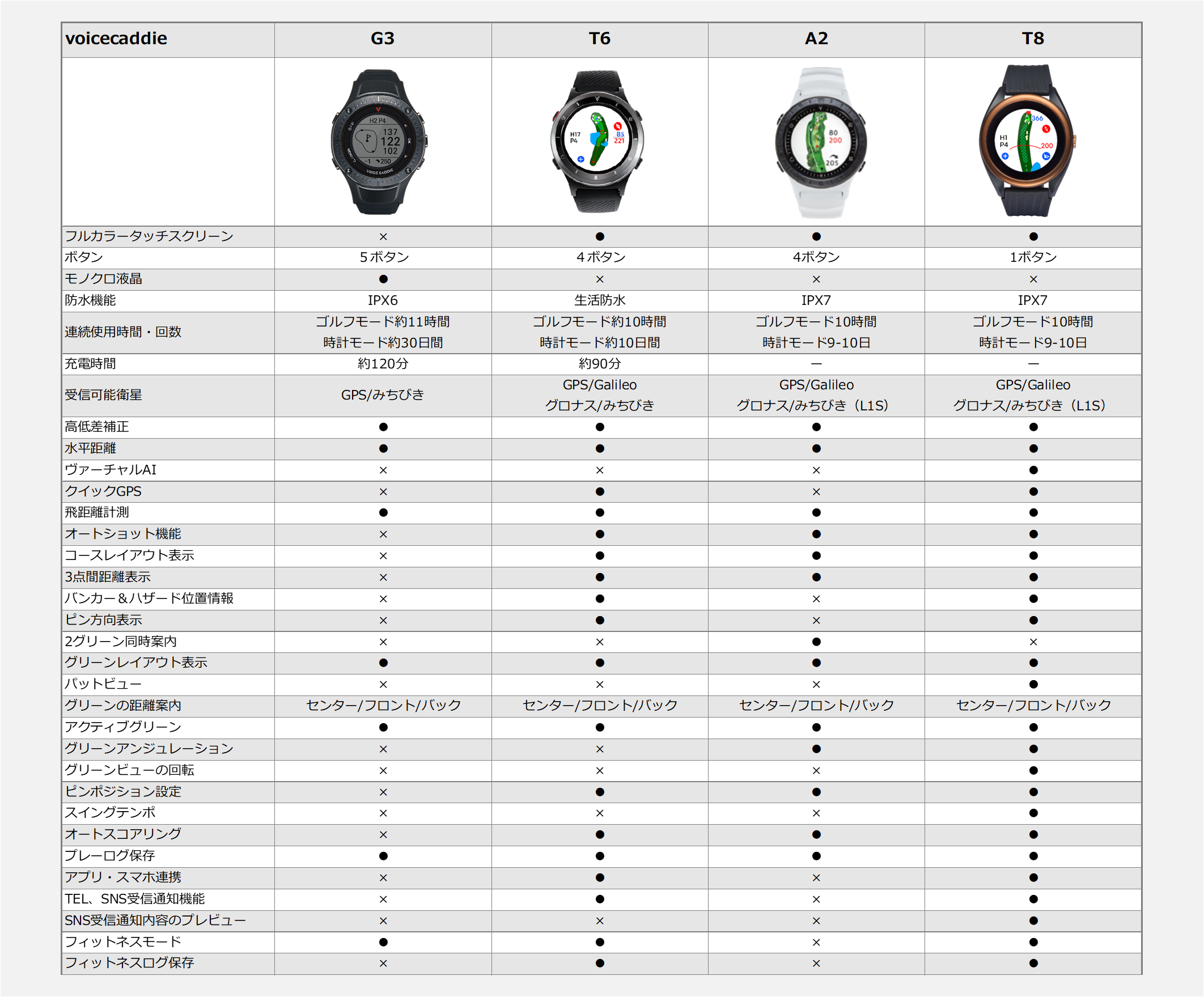 【ボイスキャディ時計型GPS距離計比較表】